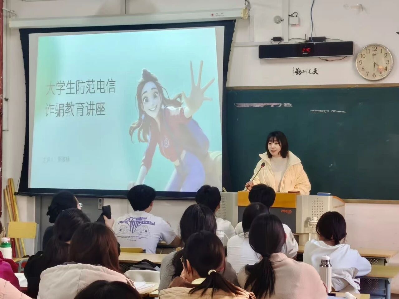 活动伊始,银行工作人员郭老师围绕电信诈骗的原因、现状、手段、防范措施、应对方法以及银行提供的诈骗服务六个方面展开讲述,她指出,当前诈骗形式多样,如兼职刷单诈骗、冒充公检法诈骗、网络贷款诈骗等等,不仅危害个人财产,也会影响社会安定。并分析了常见诈骗手段。她强调,大学生因社会经验不足易成为目标,切勿贪小便宜吃大亏,一旦受骗应立即报警,保存证据并联系银行冻结账户。