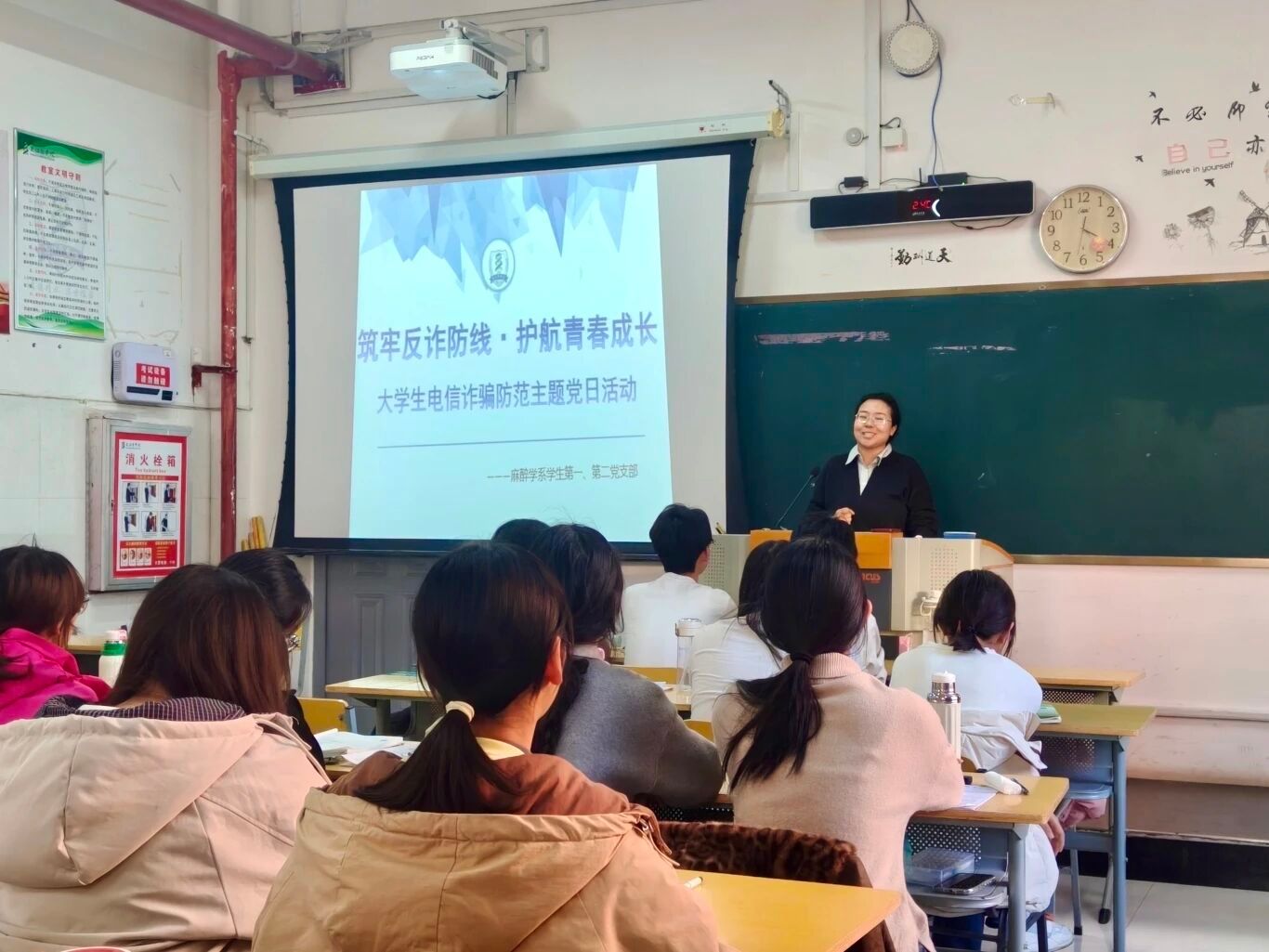 为了提升大学生对诈骗手段的识别能力与防范意识,避免财产损失。麻醉学系于2025年11月21日在养正楼20教举办大学生防范电信诈骗教育讲座。出席本次活动的有麻醉学系学生第一党支部书记王孝琴、学生第二党支部书记鱼洋、银行工作人员、入党积极代表分子以及25级全体学生。