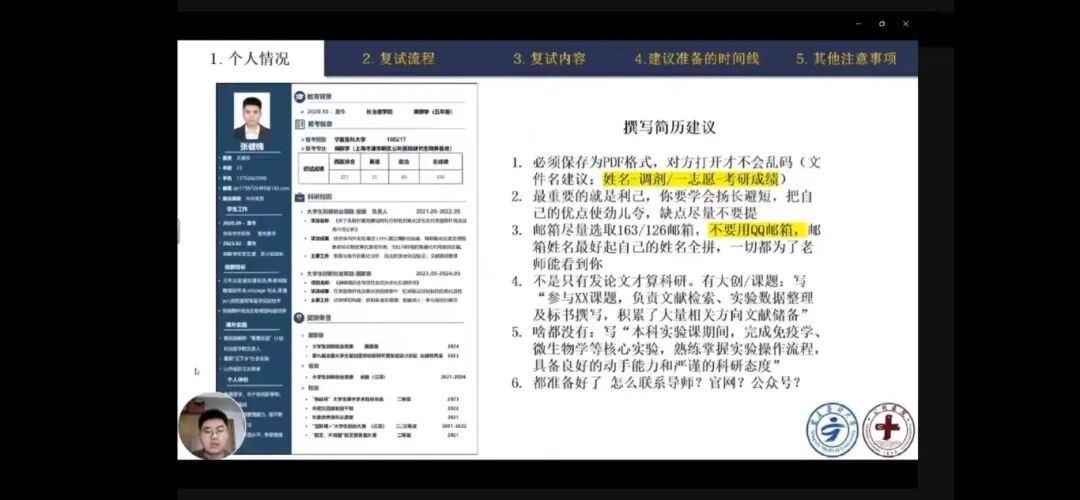 上海浦东新区公利医院研究基地张健楠同学聚焦简历撰写与话术技巧,从格式规范、文件命名到科研经历梳理,逐一给出实操性建议,助力学子打造亮眼复试材料。