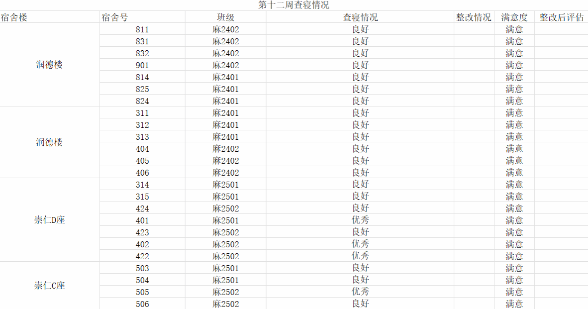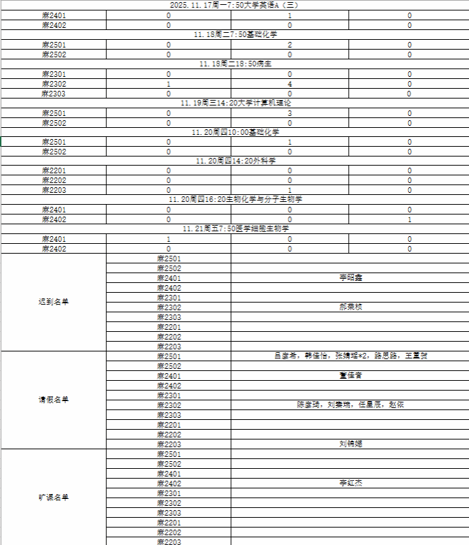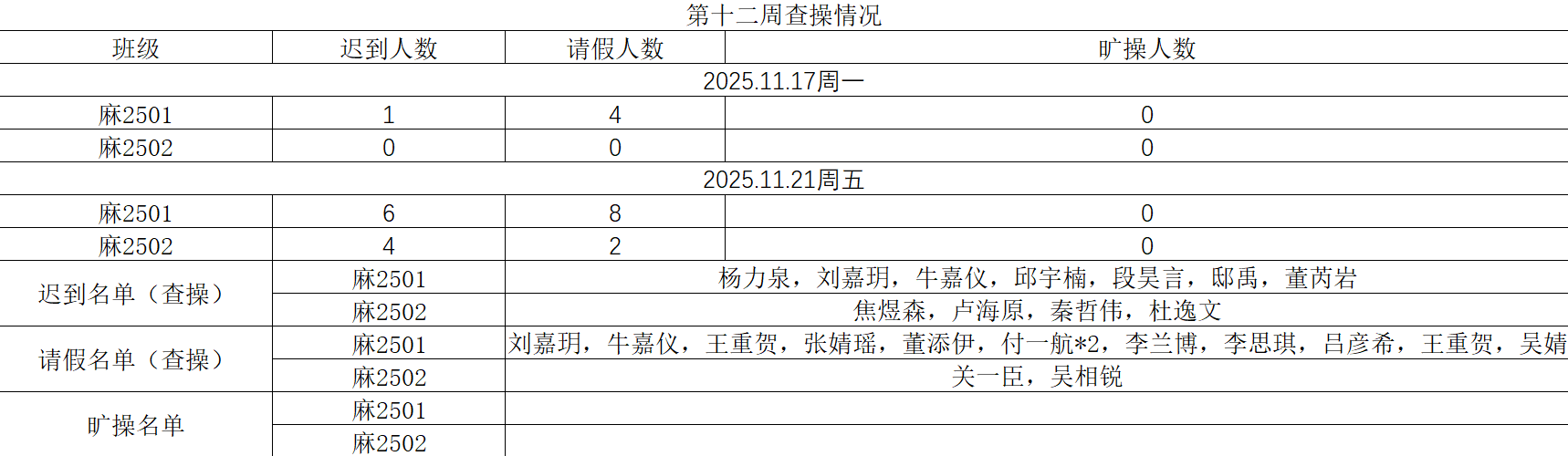 以下是2025年11月17日到11月23日(第十二周)的查课查操查寝情况