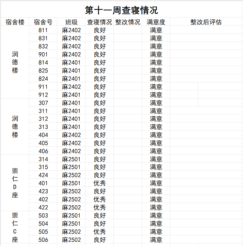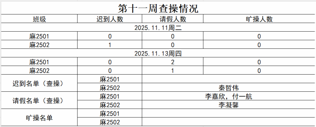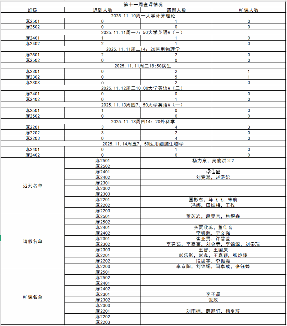 以下是2025年11月10日到11月16日(第十一周)的查课查操查寝情况