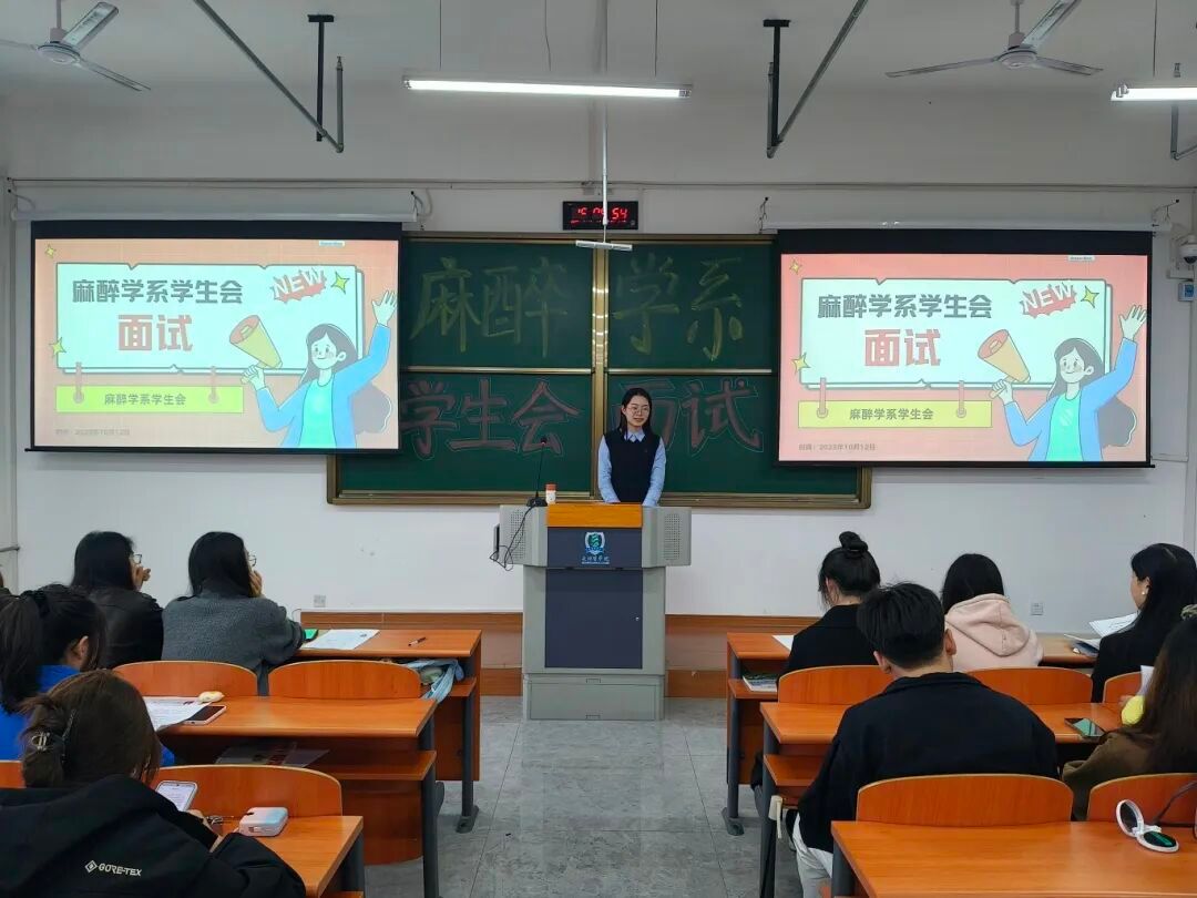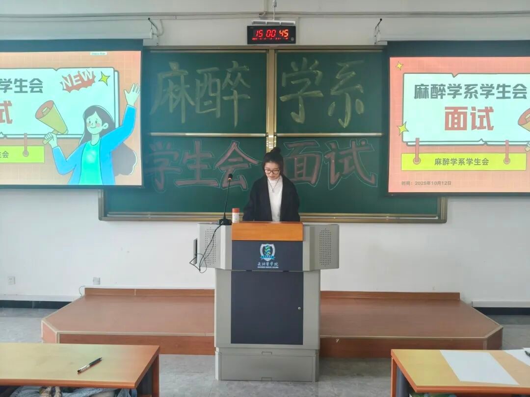 面试环节中,25级新生依次上台,或从容阐述个人优势与工作理解,或分享对目标部门的期待与设想。他们的发言虽青涩却充满力量,尽显麻醉学子的积极风貌;各部门干部结合需求提问,双方深入交流,现场互动频繁、气氛活跃。